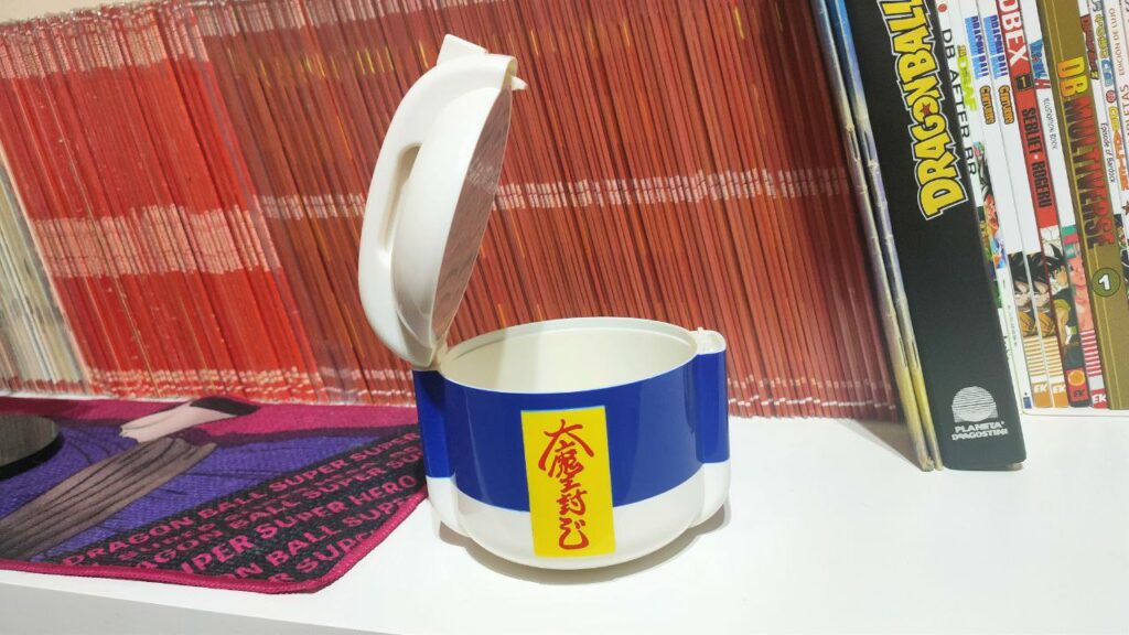 Esta pieza corresponde a un juguete oficial japonés inspirado en el recipiente utilizado en la técnica Mafūba, uno de esos elementos visuales de Dragon Ball que, aunque aparecen de forma